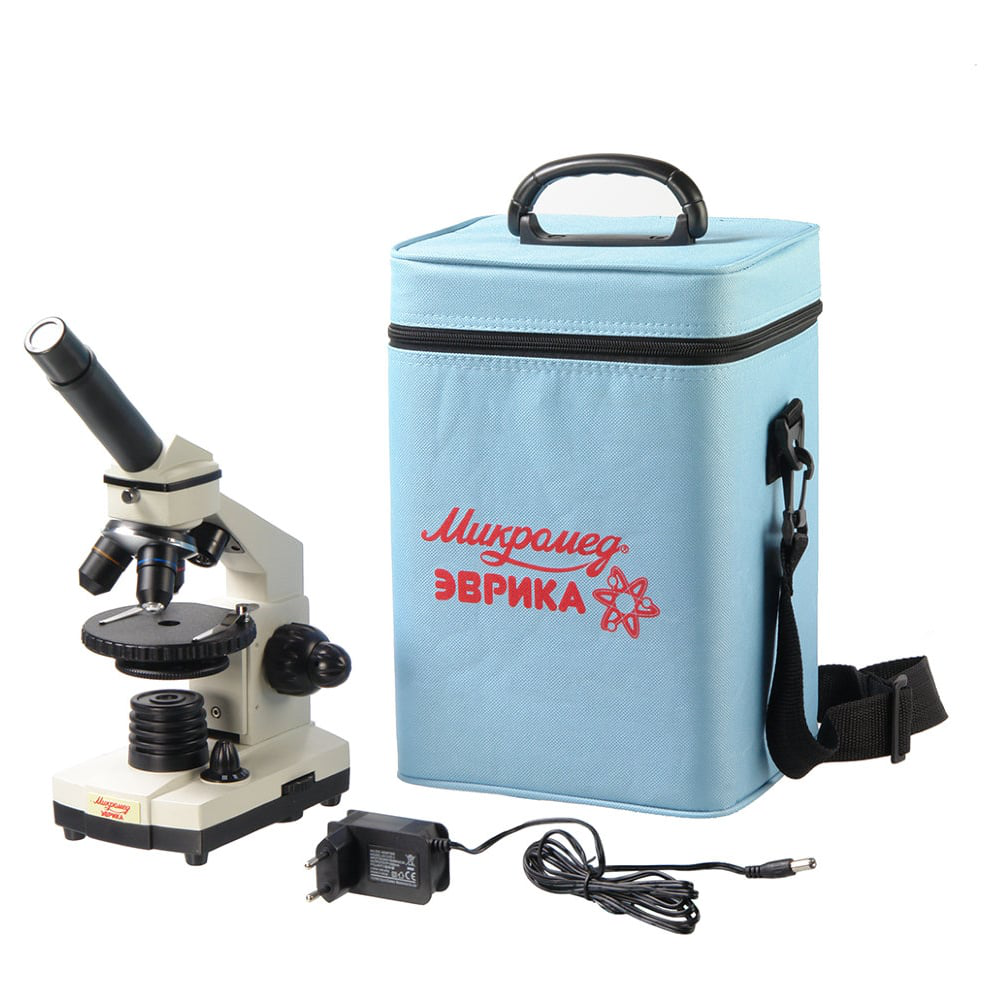Школьный микроскоп Микромед Эврика 40х-1280х в текстильном кейсе 22831 - отличный вариант для лабораторных работ в домашних условиях, учебных заведениях или на природе. Подходит для исследования биологических объектов в виде мазков и срезов. Использование объективов 4х и 10х позволяет изучать непрозрачные плоские объекты. Микроскоп оснащен встроенными осветителями, которые работают от сети переменного тока 220В, либо от трех батареек типа АА. Оптические элементы из стекла и металлическая конструкция обеспечивают высокое качество изображения и продолжительный срок службы прибора.