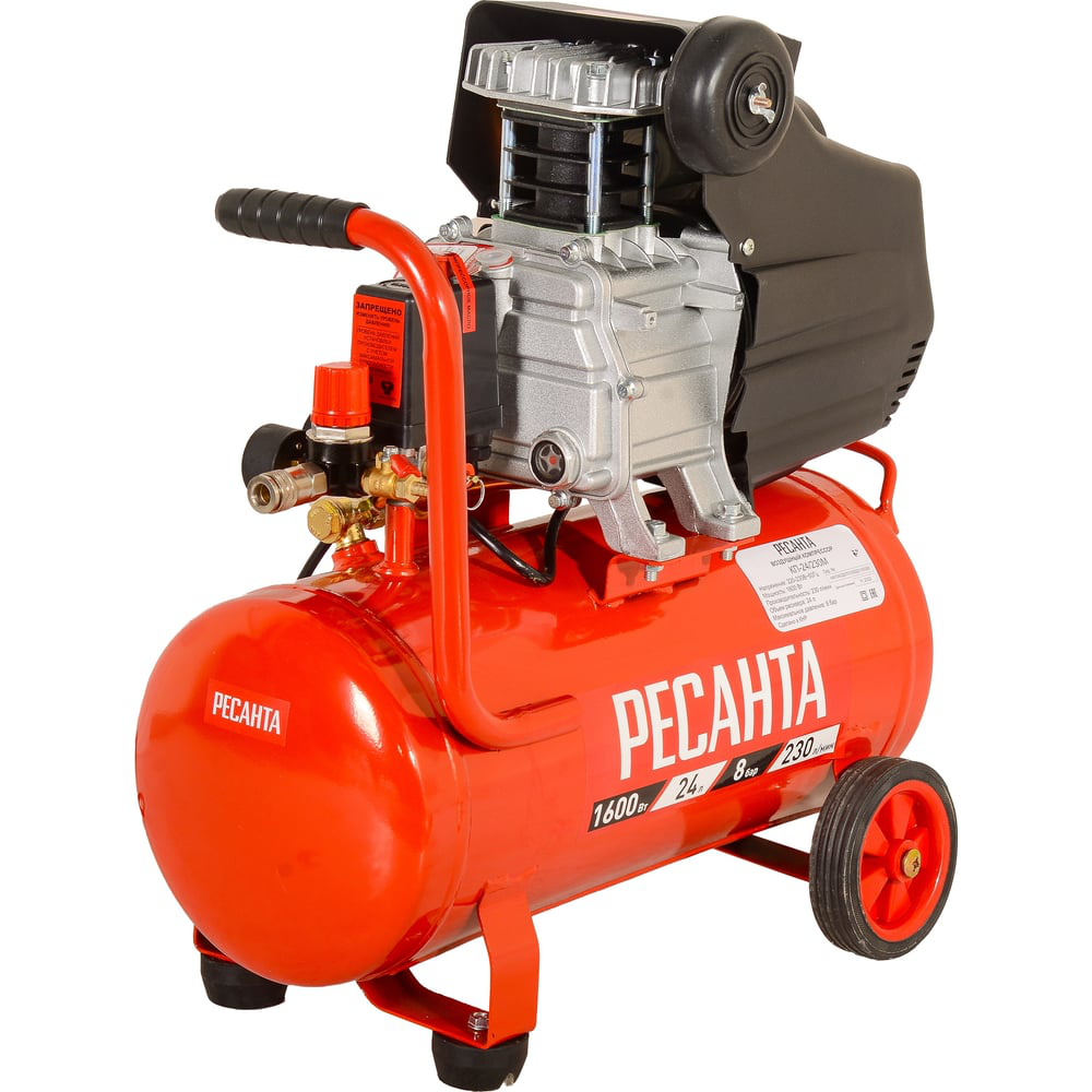 Модель компактного компрессора с прямой передачей Ресанта КП-24/230М служит для создания сжатого воздуха под давлением 8 бар с последующей подачей его в различный пневмоинструмент и оборудование. Она оснащена двигателем с одним цилиндром, ресивером объёмом 24 л и электромеханическим блоком управления. Для поддержания заданного значения давления используется прессостат, а для возможности его настройки на необходимый уровень – специальный регулятор. Номинальная мощность модели Ресанта КП-24/230М составляет – 1600 Вт. Производительность - 230 л/мин. Тип компрессора – поршневой. Система смазки – масляная. Для обеспечения контроля давления в ресивере и на выходе из редуктора предусмотрены два манометра.На агрегате установлен воздушный фильтр, обеспечивающий очистку попадающего в агрегат воздуха. Воздушный шланг подключается посредством быстросъёмного соединения. На дне ресивера установлен сливной клапан для удаления конденсата. Безопасность работы устройства обеспечена наличием термозащиты, которая служит для отключения агрегата при перегреве и последующего его включения после охлаждения. Для удобства перемещения предусмотрены колёса и удобная рукоятка. Электропитание осуществляется от сети 220 В, 50 Гц. Вес компрессора – 19.2 кг.