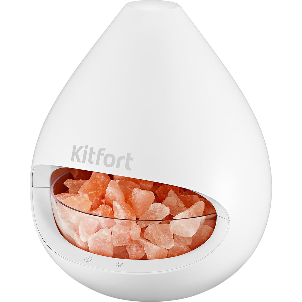 Ультразвуковой увлажнитель воздуха KT-2844 увлажняет и ароматизирует воздух в помещении, создавая хороший микроклимат для проживания людей. КТ-2844 простой в эксплуатации и обслуживании, отличается высокой надежностью в работе. Может использоваться в помещениях, площадь которых не превышает 15 м². В основании увлажнителя расположена галогеновая лампочка, которая может работать как декоративный предмет интерьера, без части увлажнителя. Лампочка нагревается и немного нагревает кристаллы соли. Соль при этом даёт слегка заметный запах. Галогеновая лампочка испускает натуральный свет по сравнению со светодиодными конструкциями, создавая больший уют и приятную атмосферу. Есть 5 ступеней яркости. Ультразвуковые увлажнители считаются наиболее эффективными из существующих увлажнителей воздуха. Принцип работы такого увлажнителя прост. Внутри него стоит пьезокерамический излучатель, погруженный в воду, который с помощью ультразвуковых колебаний выбивает с поверхности воды мельчайшие капельки воды, создавая водяной туман. Этот туман выдувается наружу небольшим вентилятором, а затем разносится по объему помещения естественными воздушными потоками. Частицы тумана мелкие, они обладают большой суммарной поверхностью, а потому быстро испаряются, что приводит к повышению относительной влажности воздуха.