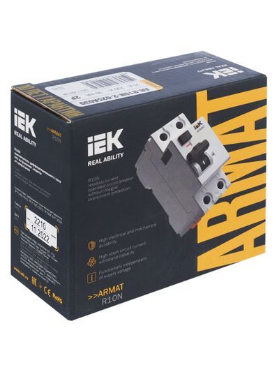 Выключатели дифференциального тока ARMAT серии R10N выполняют функцию защиты поражения человека электрическим током, а так же защиты от пожара при возникновении замыкания на землю. Модельный ряд включает в себя устройства с типами защитных характеристик по дифференциальному току AC, A, AC-S, A-S; номинальными токами от 25 до 100 А; номинальными дифференциальными токами срабатывания от 10 до 300мА. Условная отключающая способность ВДТ ARMAT серии R10N составляет 10 кА.